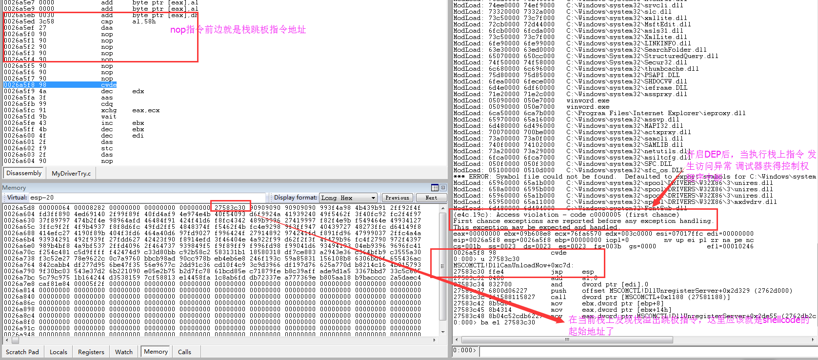 2.开启DEP功能,当执行异常后直接在shellcode首地址断下,再查看堆栈找到栈溢出跳板地址