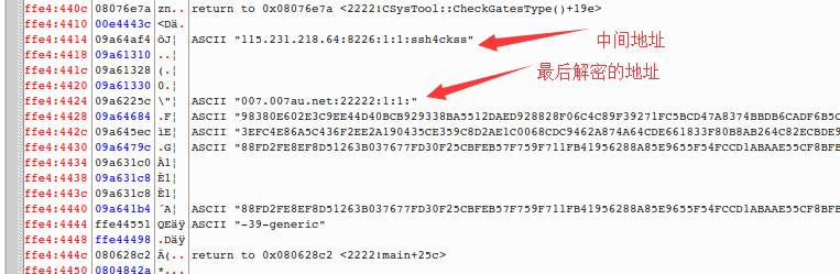 在Ikdfu94()+1a1解密出一个控制端地址中间量,后面部分的0x8130800地址的位置ida会出现反编译失败的情况,而进入这里面会发现会在解密出一个控制端地址,搜索发现这个可能才是真正的控制端地址(反正没怎么搞清楚c++的代码逆向这些类成员怎么存的….),之前以为这个中间量就是控制端地址后面进入0x8130800后才发现这一步才是真正的解密出控制端的地址。